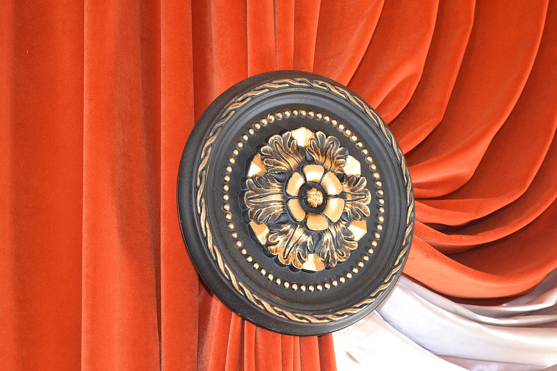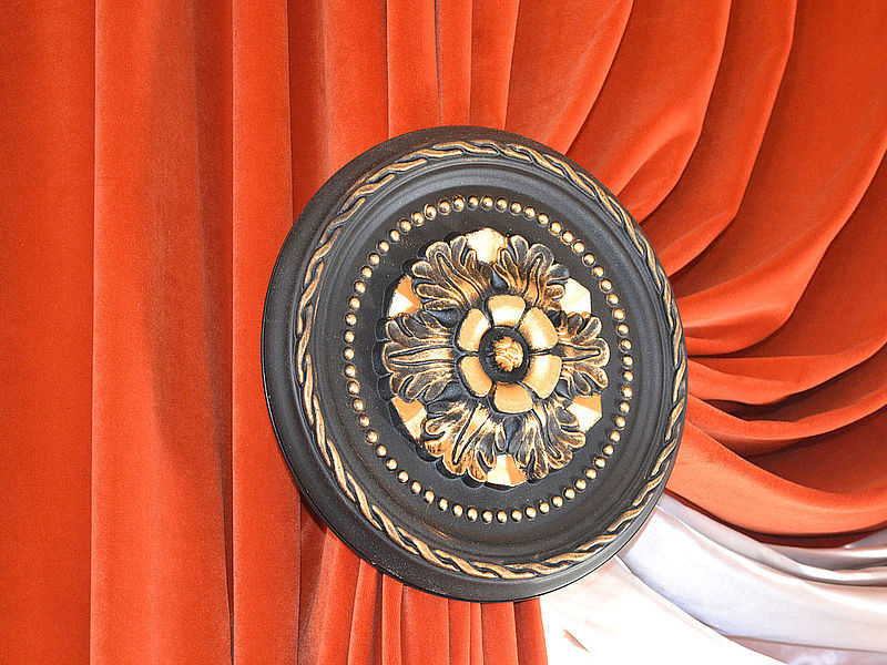 Lustres à l'ancienne, somptueuses tentures en velours.