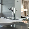 Une salle de bain aux lignes sobres pour plus de clarté. Des tons gris tourterelle harmonisent l’ensemble. La tablette est réalisée sur mesure faisant place belle au design de la vasque.