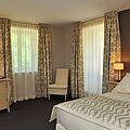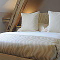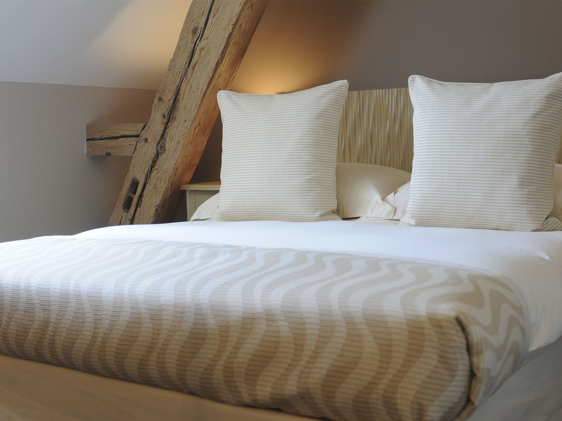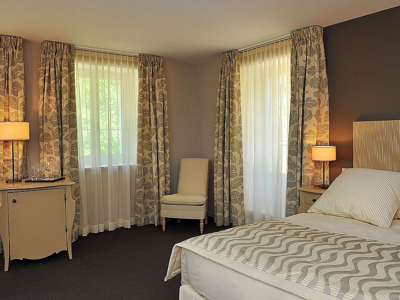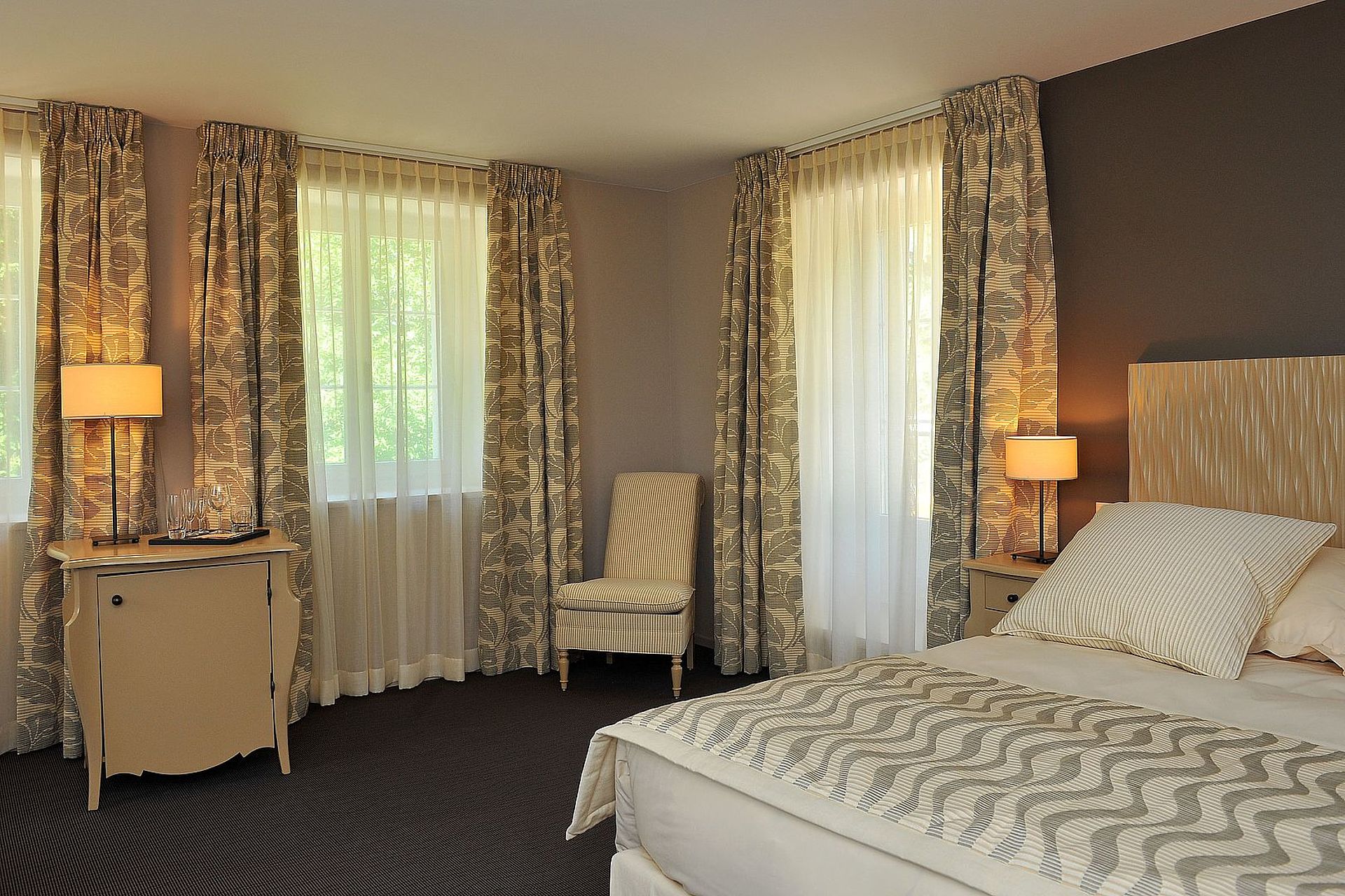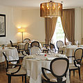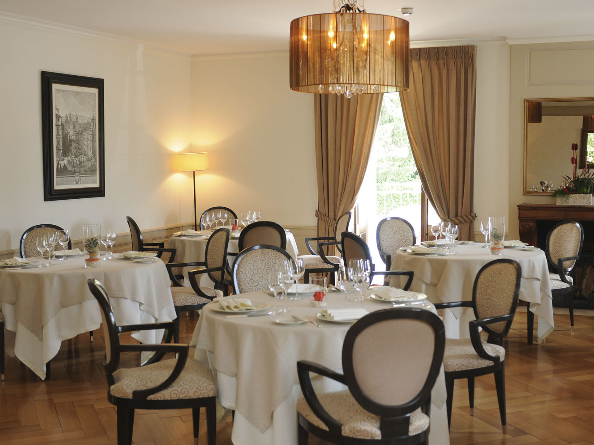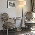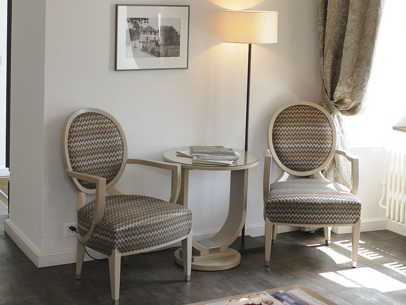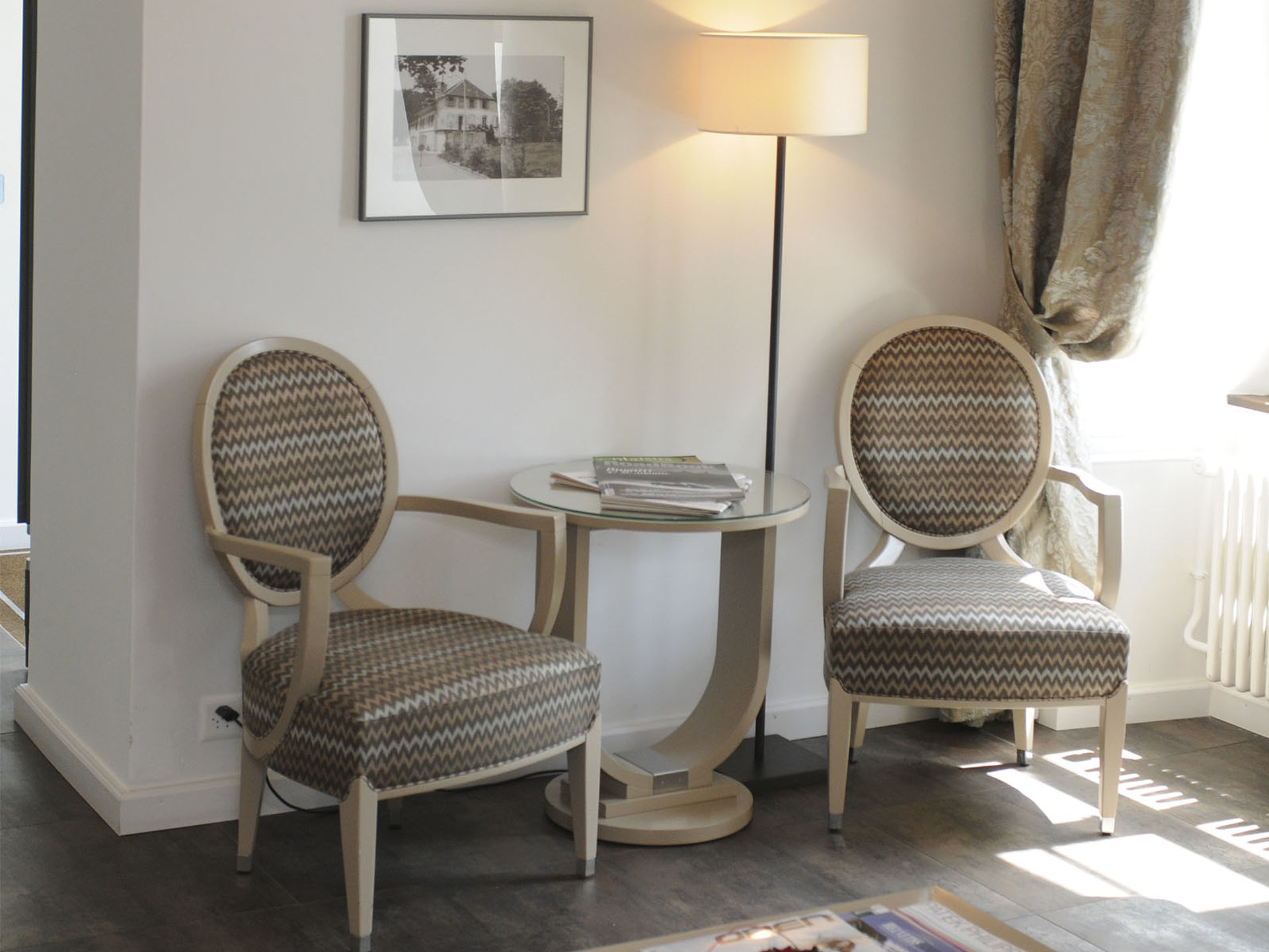 Chaise médaillon et tables rondes, tissus aux motifs étudiés dans des coloris clairs et intemporels pour une touche de classicisme revisité pour cette hostellerie de charme.