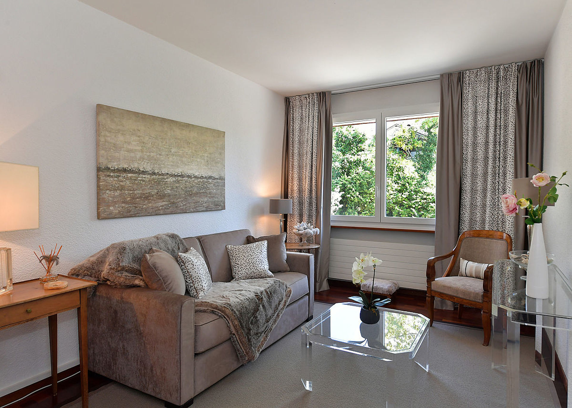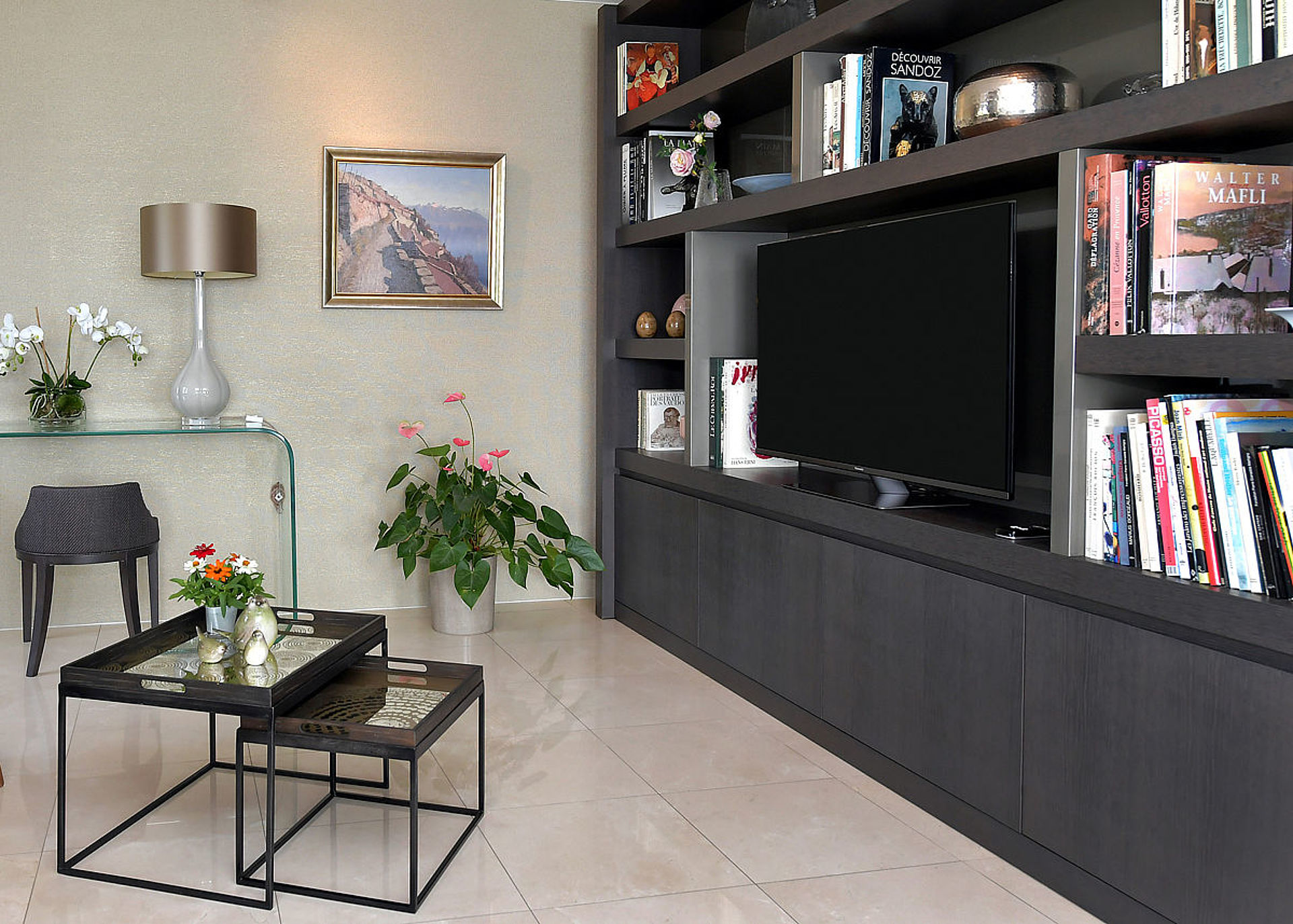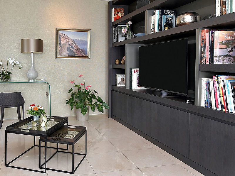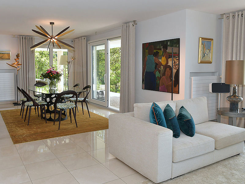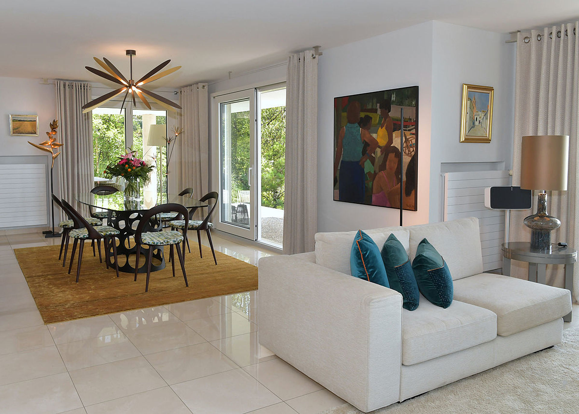 Les matières sont douces et onctueuses. Les tableaux et luminaires apportent une touche personnelle à chacune des pièces. La salle à manger est soulignée par la couleur de son tapis.