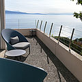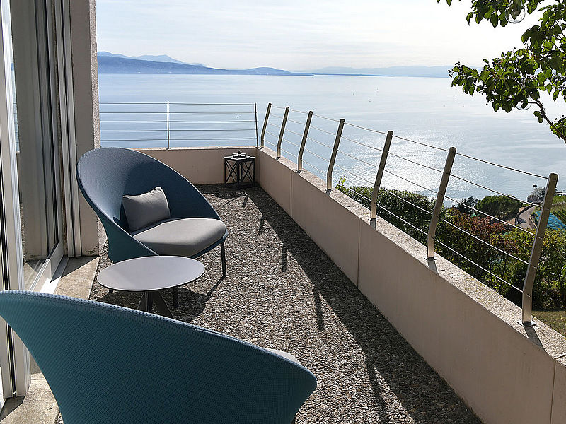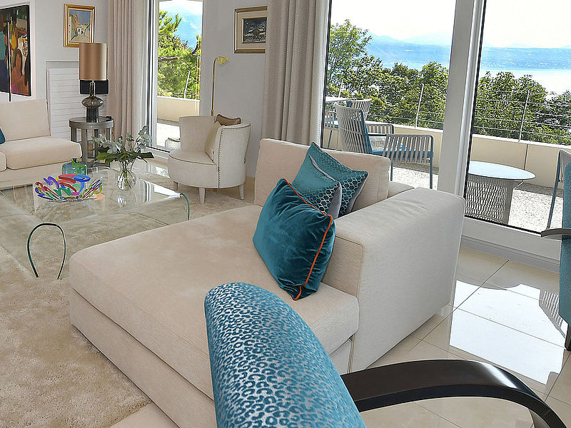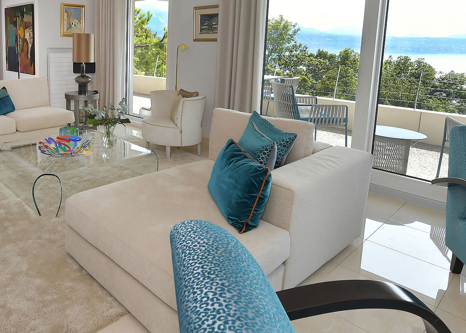 Pour cette villa des années 70, les espaces intérieurs ont été rénovés. Des meubles clairs soulignés d’un bleu turquoise mettent en avant la vue imprenable sur le lac.